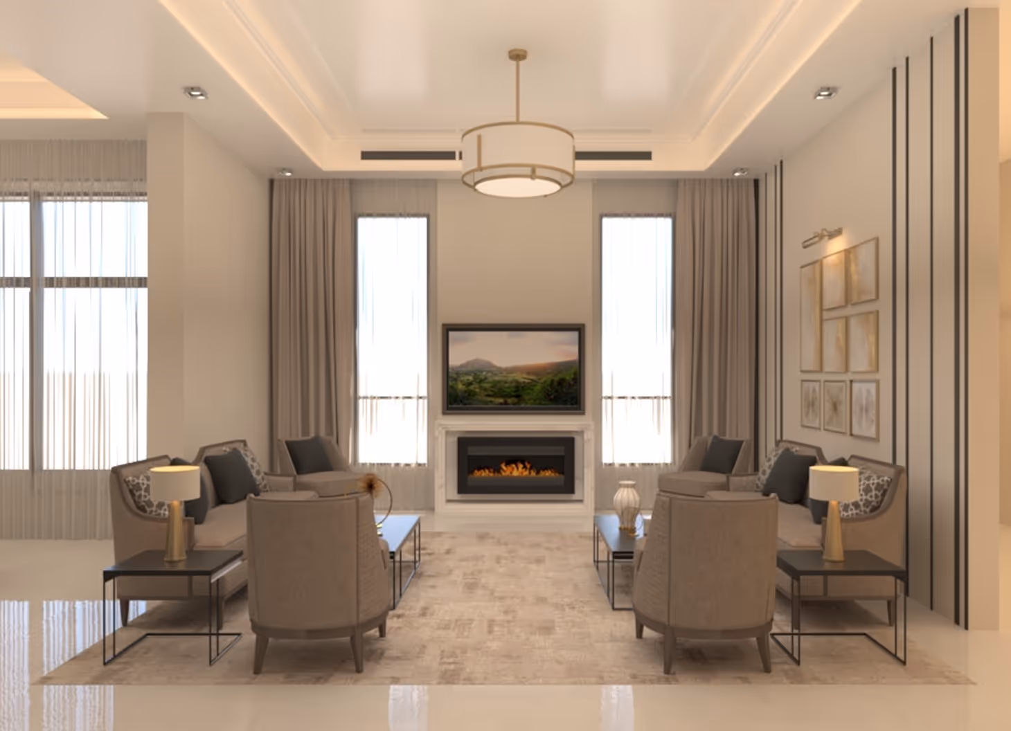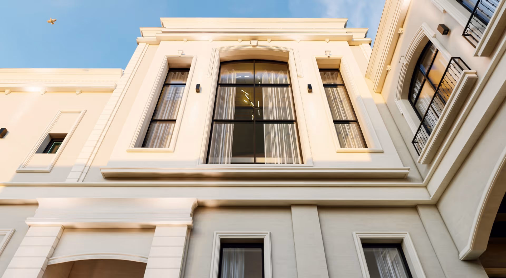 A two-story height villa designed in neo-classic style. The ground floor includes the family and guest living spaces. They are all open to each other reflecting spacious feeling. The upper floors are the private family bedrooms and entertainment rooms.